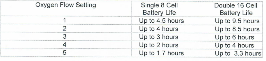 Four settings of breath detecting pulse oxygen flow which conserves energy and recharging time.